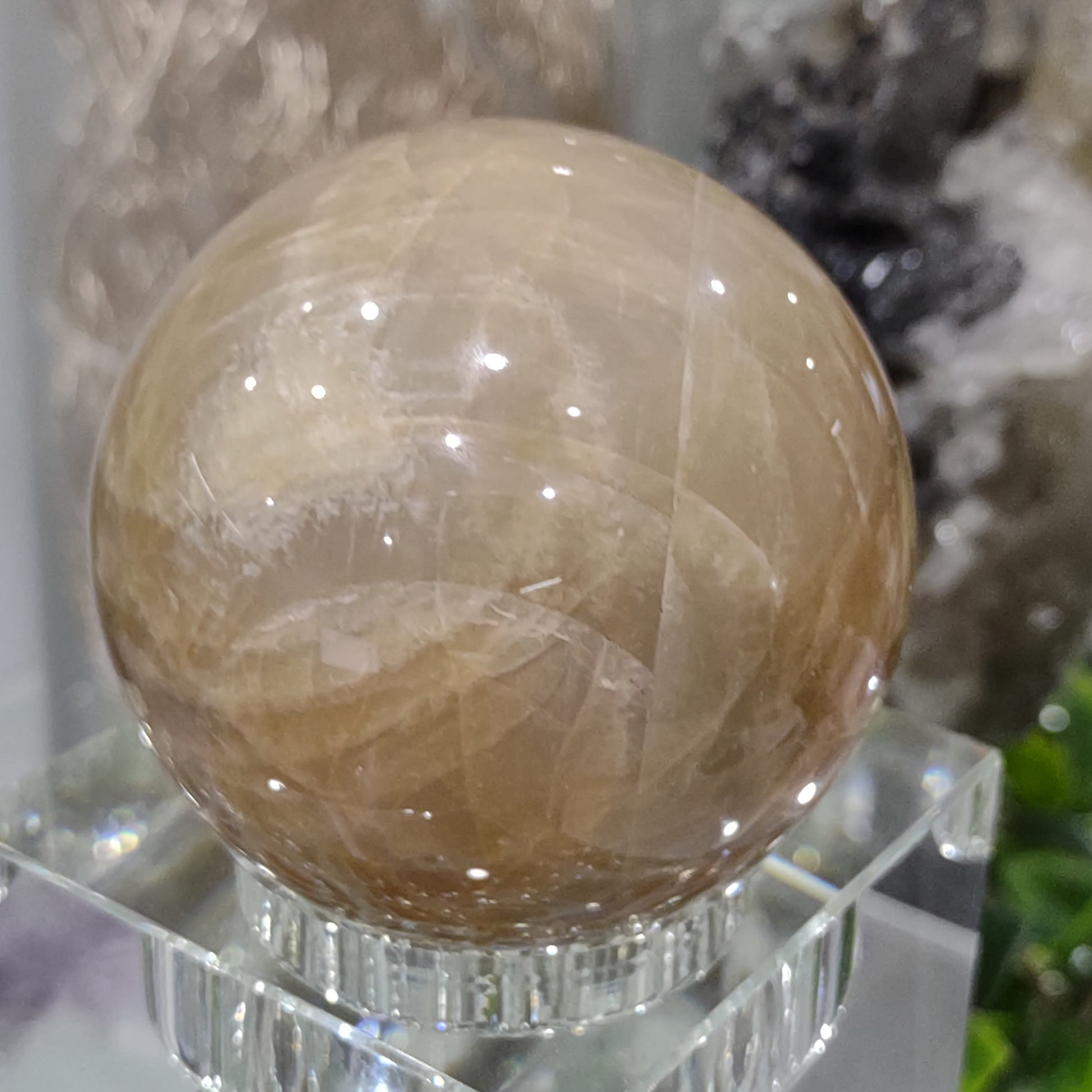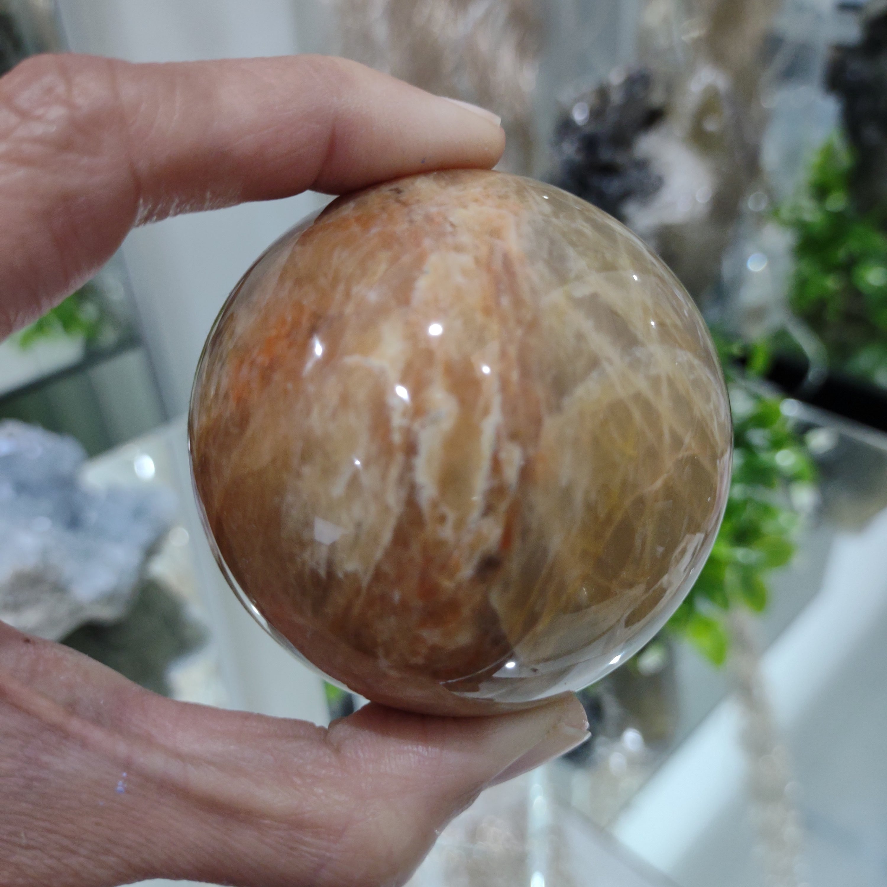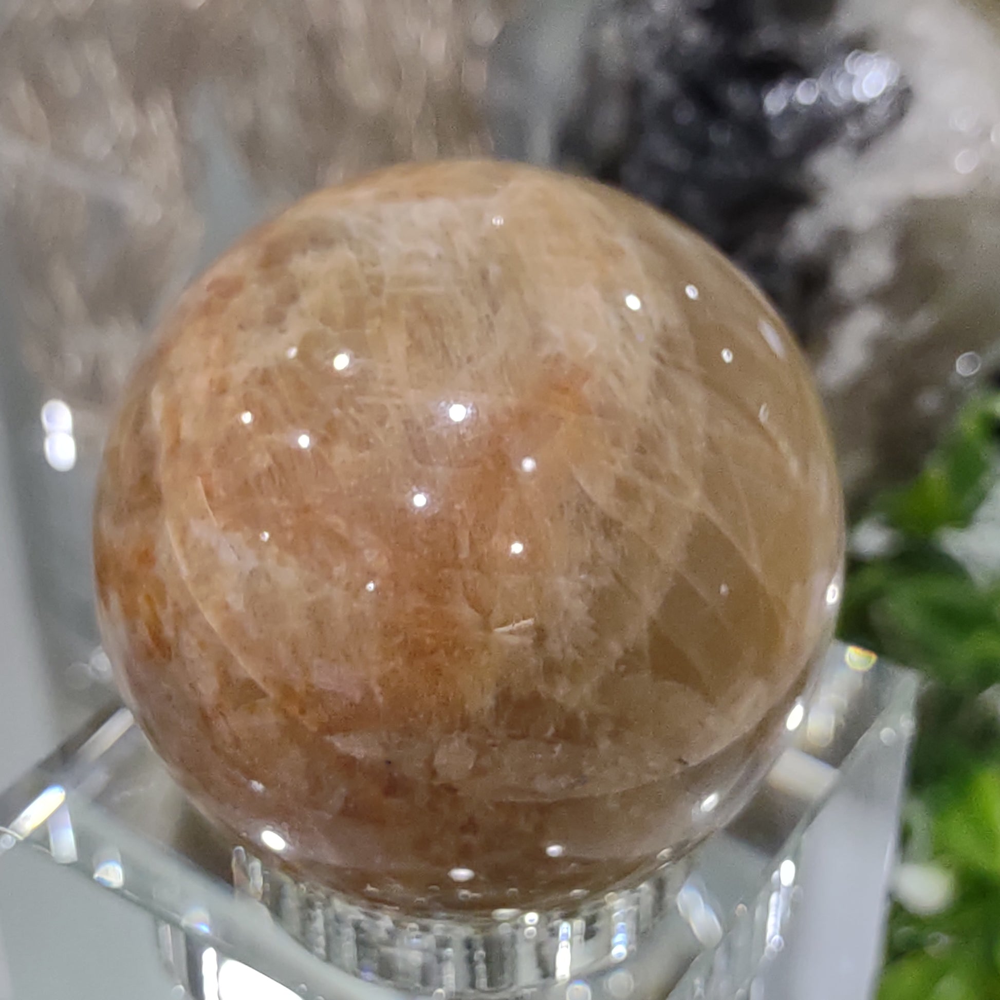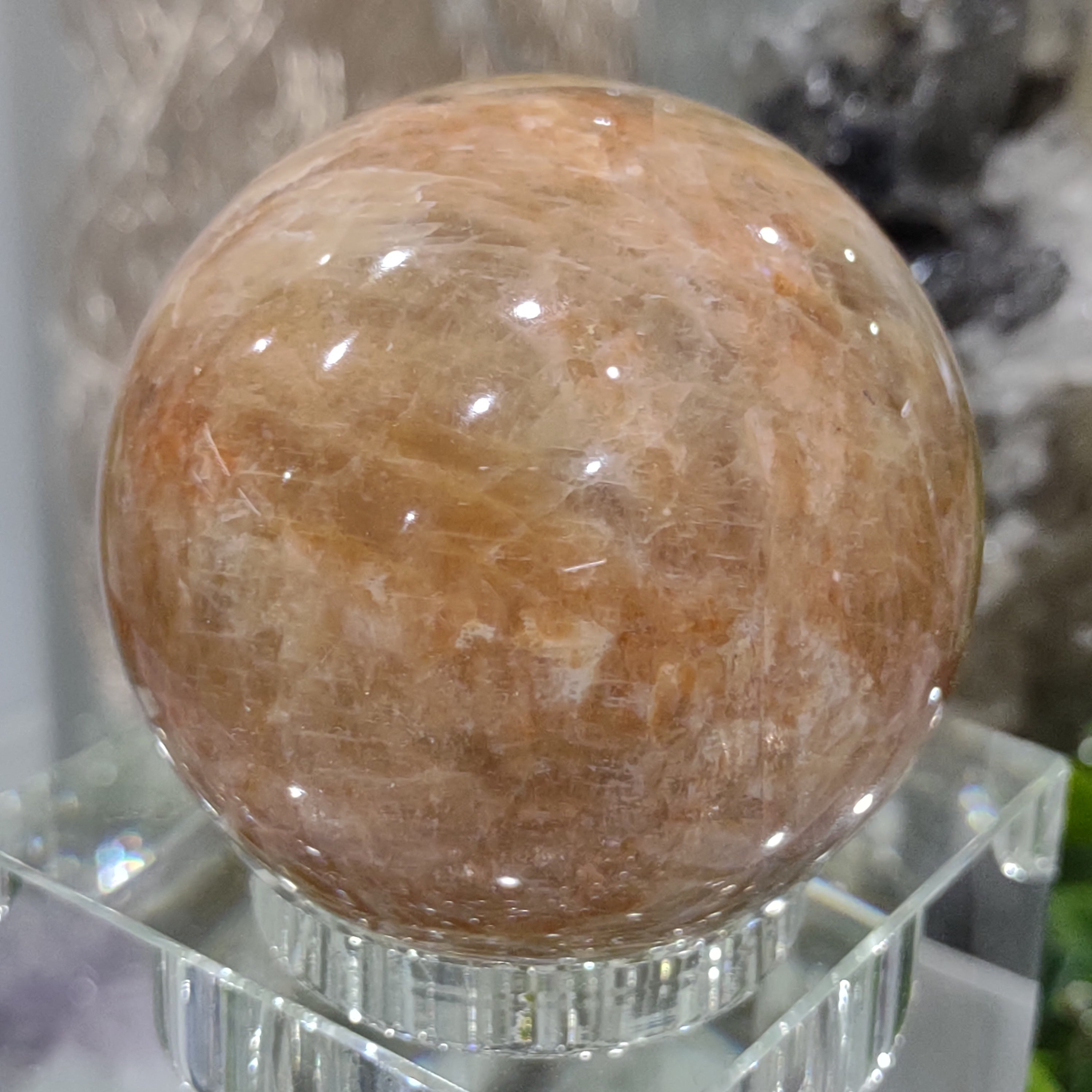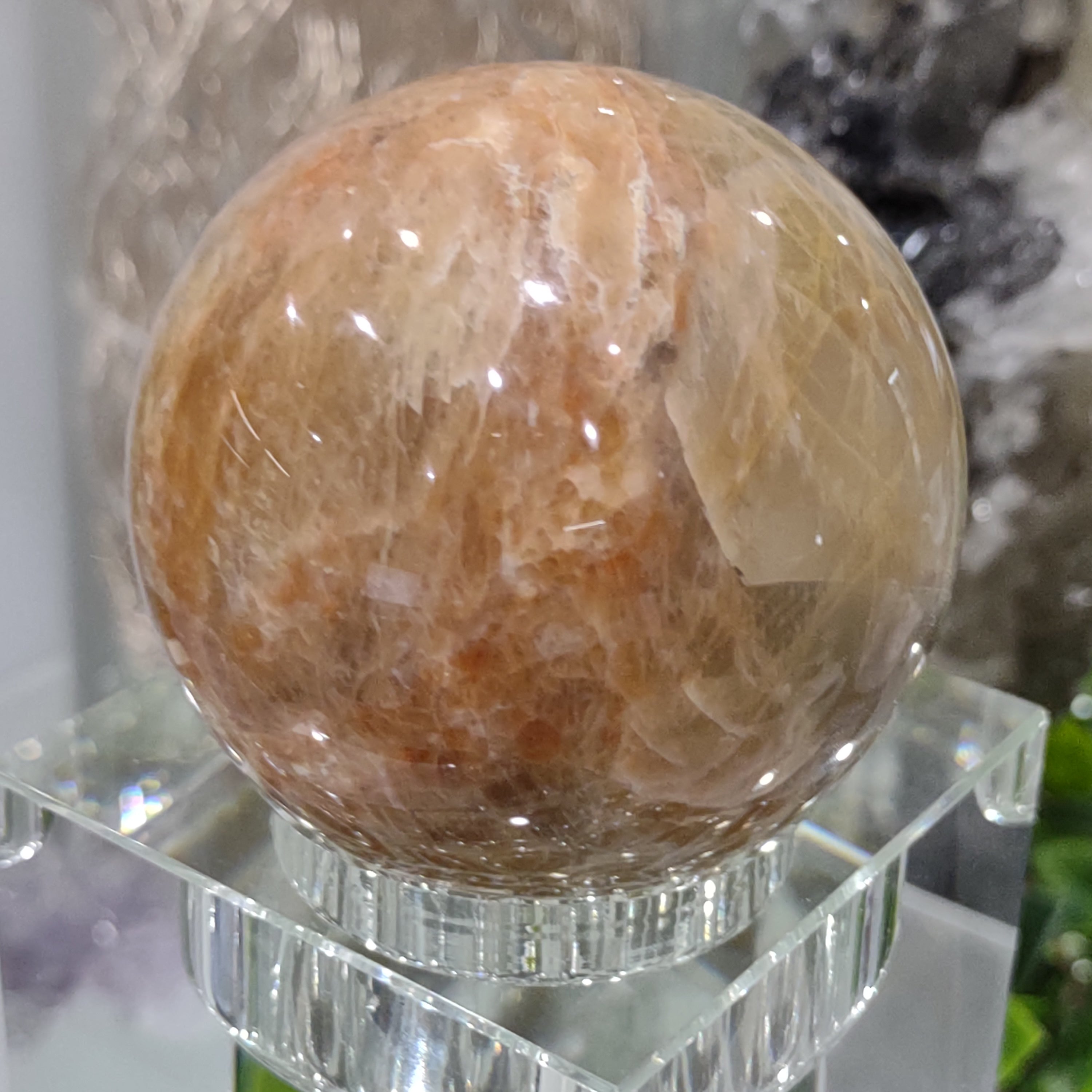 This enchanting Peach Moonstone sphere has a lovely colour palette of marbled Dark to Light Peach with a magical flash.